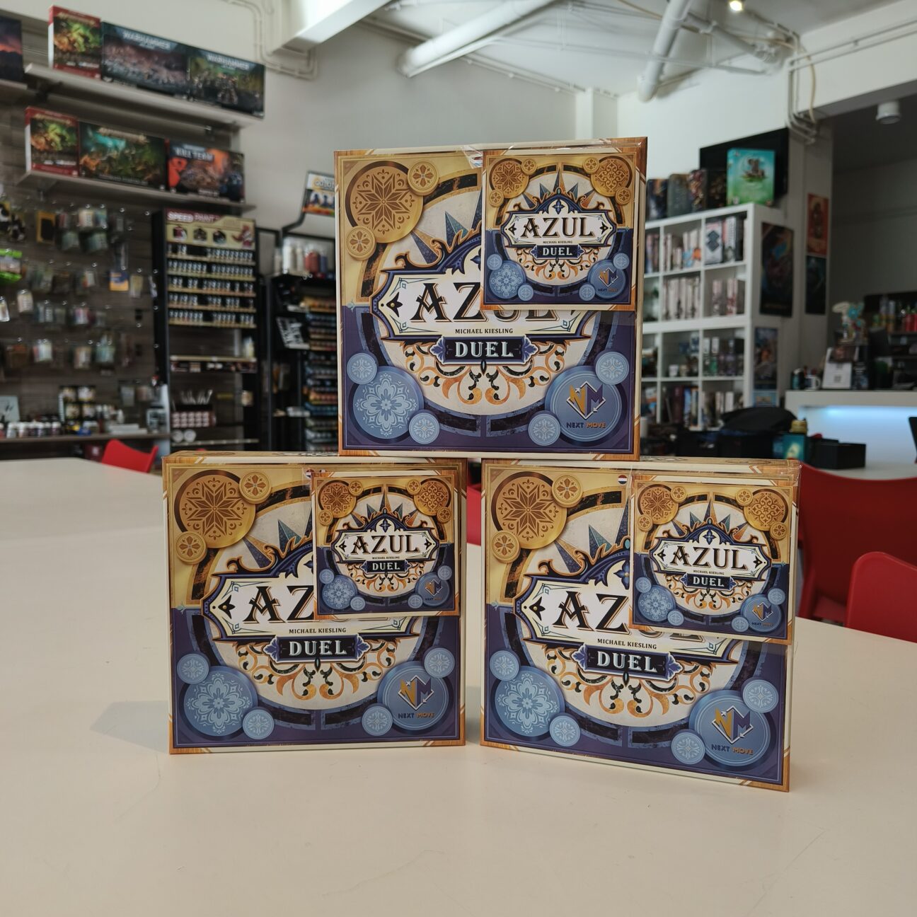 Het bekende tegeltjes spel Azul; heeft zich zeker genesteld in de lijst met moderne klassiekers. Elke versie (het zijn er nu al zeven) van het spel is hetzelfde, maar toch net een beetje anders, en op deze manier blijft menig spellenfanaat geinteresseerd in deze game. Nu is er eindelijk een specifieke twee speler variant van Azul: het zeer ongeinspireerd genaamde Azul Duel. Toch is deze twee speler game zelf niet ongeinspireerd. Je beslist niet alleen welke tegels je neemt, maar ook op welke manier ze gelegd moeten worden om punten te scoren. Zo kan je je enige tegenstander flink achter het behang…. ik bedoel tegels plakken!
