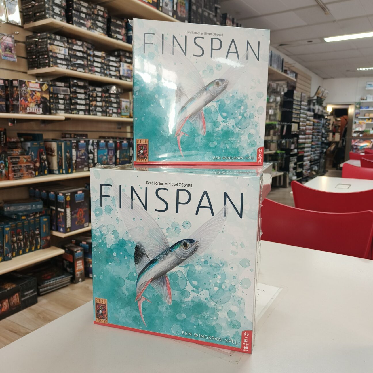 Het is weer zo ver! Een nieuwe uitgave van Stonemaier Games, een nieuwe game in de lijst van ….-span spellen. Deze keer zijn de vissen aan de beurt. In Finspan speel je net zoals in de andere games in de serie (Wingspan en Wyrmspan) wezens die je grondstoffen, punten of andere bonussen geven. Ook heb je verschillende zones waar bepalde vissen wel en niet thuishoren. Plaats je ze goed, dan leggen je vissen meer eieren, worden je scholen groter en ben je na vier weken ichtyologisch onderzoek de winnaar! Voor nu hebben we alleen de Nederlandse versie van Finspan beschikbaar, de Engelse versie komt er zo snel mogelijk aan.