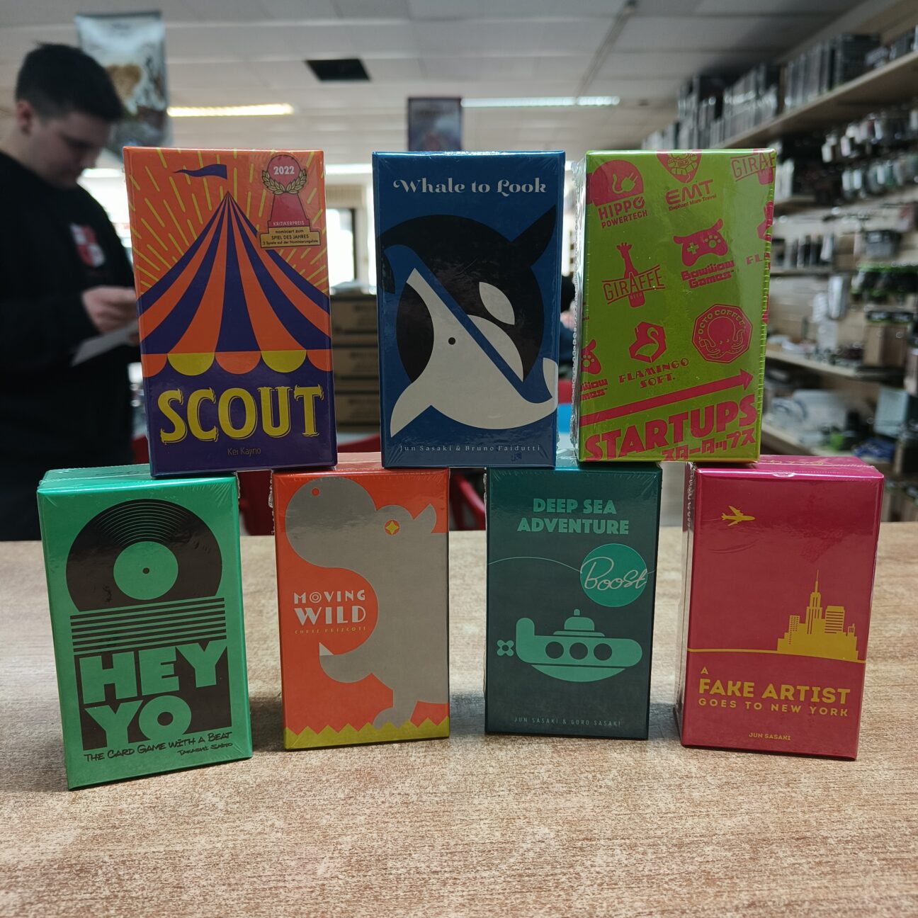 Ik moet zeggen; ik ben echt excited voor de kleine spelletjes van Oink Games. Dit Japanse design bedrijf heeft als missie om leuke en vooral interessante spellen te ontwerpen, zonder zich te laten beinvloeden door wat hip en populair is. Sinds 2011 hebben ze al 79(!) spellen uitgebracht, naast dat ze ook kunst exposities opzetten helpen met ontwerp en design voor games in film en therapie. Wij hebben vanaf nu zeven van hun spellen op voorraad: A Fake Artist Goes To New York, Deep Sea Adventure Boost, Hey Yo, Moving Wild, Scout, Startups en Whale to Look. Probeer ze vooral uit en laats ons weten wat je er van vind! Wie weet hebben we dan binnenkort meer van deze fantastische spellen.